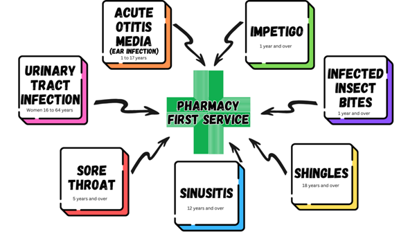 The Pharmacy First service enables community pharmacies to complete episodes of care for seven common conditions following defined clinical pathways which include self care and safety-netting advice and, only if appropriate, supplying a restricted set of prescription only medicines without the need to visit a GP.